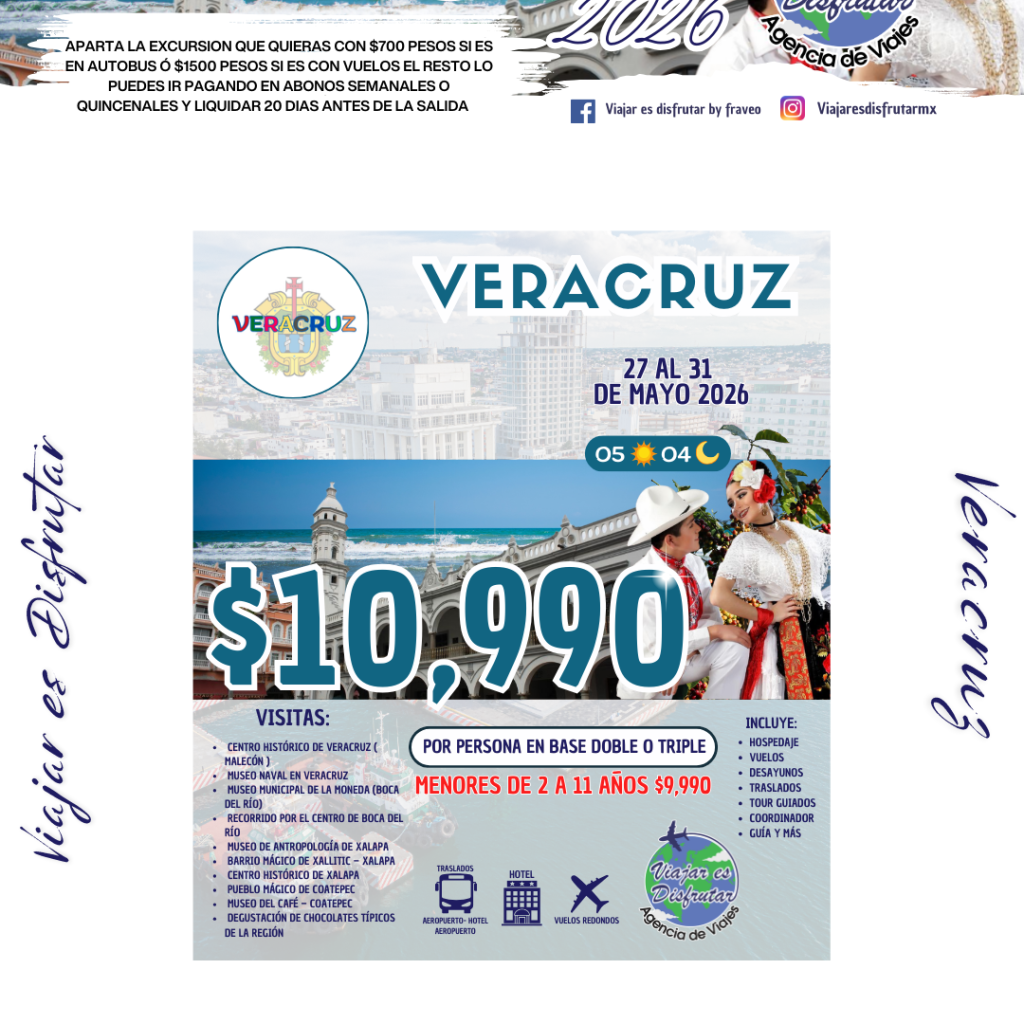 Este viaje es perfecto para quienes desean combinar historia, cultura, tradición y paisajes increíbles en un solo destino. Prepárate para disfrutar de Veracruz con la calidad y confianza de Viajar es Disfrutar. 🌊✨